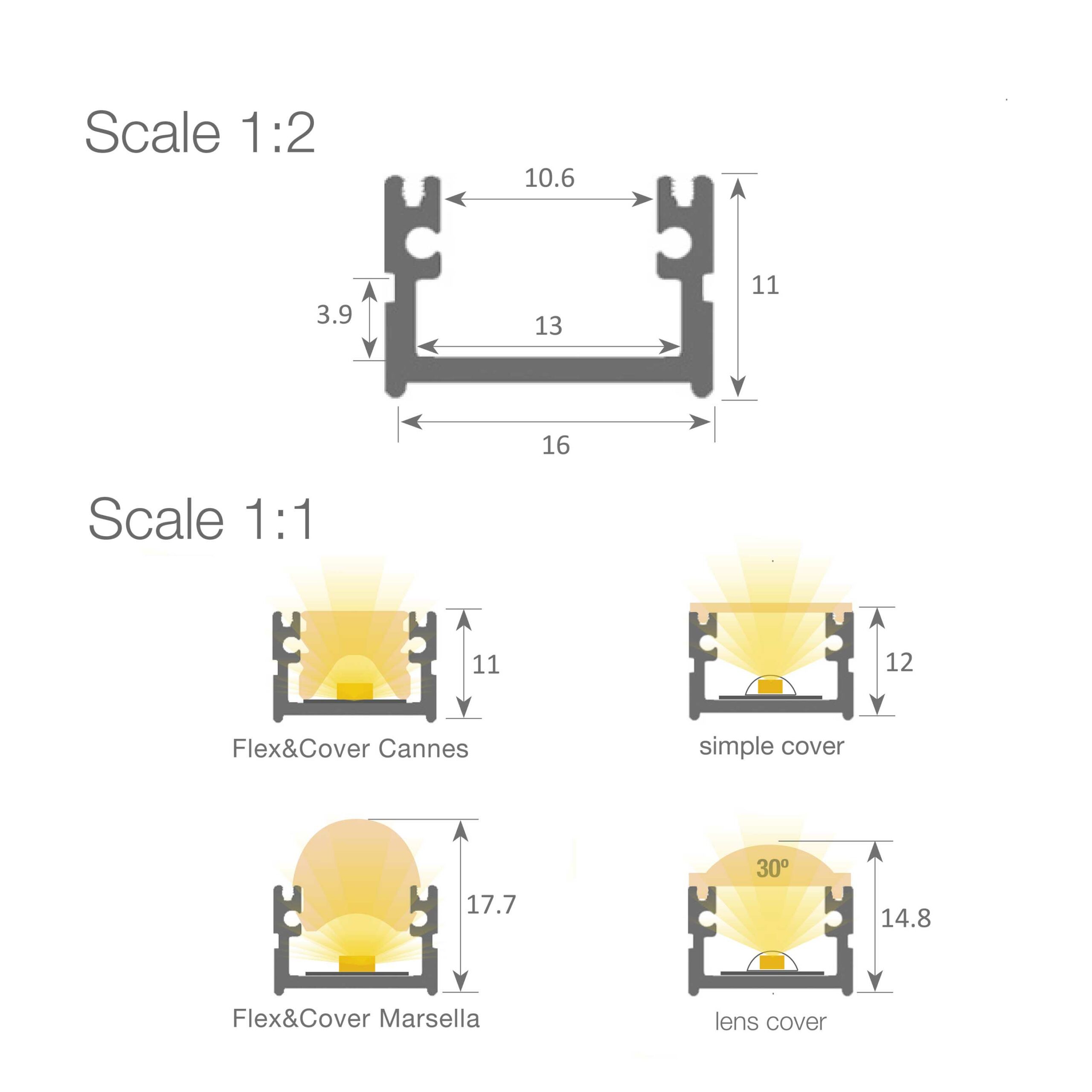 Le profilé Aluminium Roma est un profilé de surface de qualité Professionnelle. Avec une largeur intérieure de 13mm, permettant l’adaptation de ruban LED jusqu’à PCB 12mm. Ses dimensions de 11mm de profondeur uniquement, et sa fabrication en aluminium de grande pureté, il saura habiller vos intérieurs tout en se faisant discret. Idéal pour applications en surface murale, meubles, étagères. Il peut s’adapter à toute situation où vous avez besoin de profilé minimaliste aux dimensions réduites. Dissipe la chaleurs de ruban LED jusqu’à 30W/m.