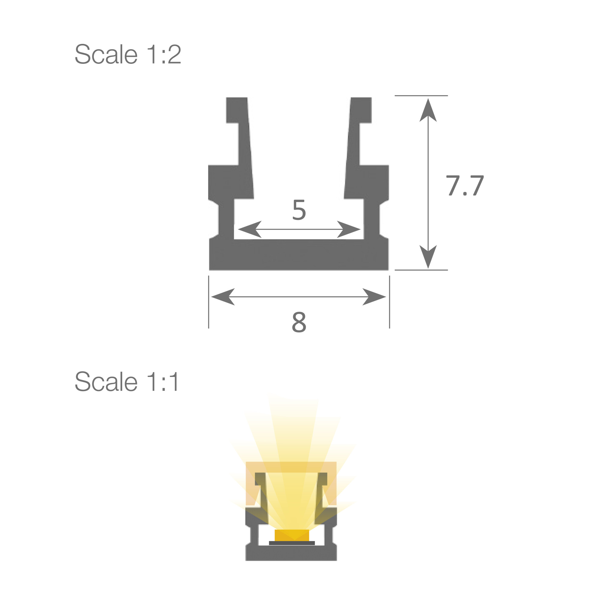 Le profilé Aluminium Detroit est un profilé de surface de qualité Professionnelle. Il a une largeur intérieure de 5mm, permettant donc l’adaptation de ruban LED jusqu’à PCB 5mm. Ses dimensions de 7.7mm de profondeur uniquement, et sa fabrication en aluminium de grande pureté, sauront ainsi habiller vos intérieurs tout en se faisant discret. Idéal pour applications en surface murale, meubles, étagères. Il s’adapte à toute situation où vous avez besoin de profilé minimaliste aux dimensions réduites. Dissipe la chaleurs de ruban LED jusqu’à 16W/m