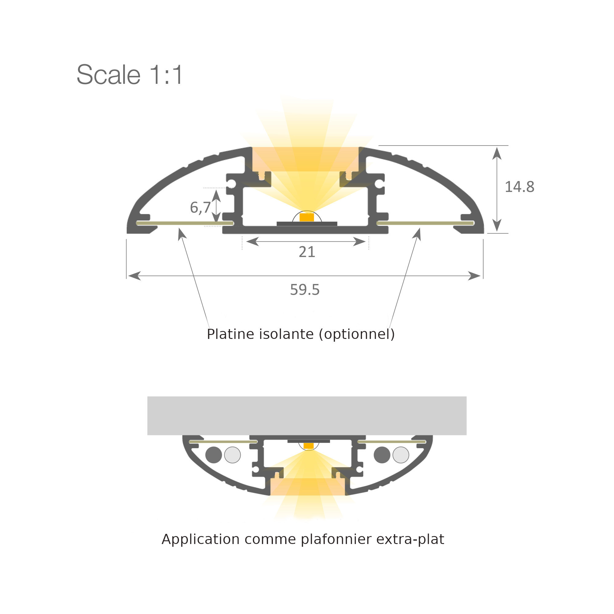 Ses deux cavités latérales permettent d’y loger tous type de câbles (pour fermer le circuit et donc réduire les chutes de tension, câbles téléphoniques, etc). Le profilé peut aussi être appliqué au plafond, devenant un luminaire de surface extra-plat.