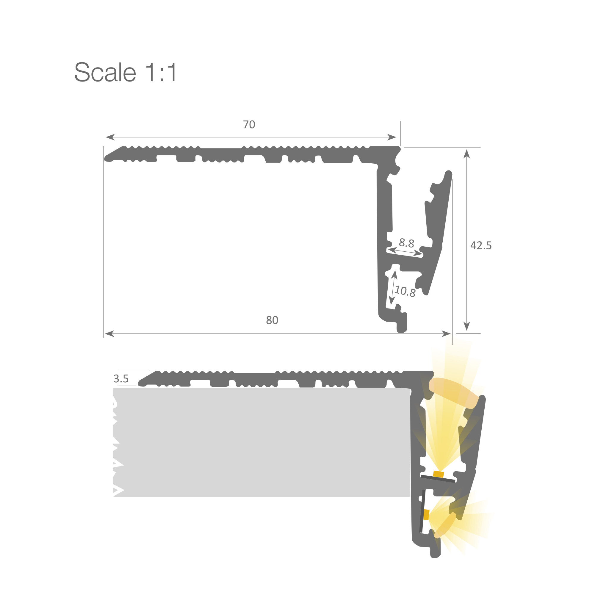 Le profilé Aluminium Niza duo est un profilé pour Escalier de qualité Professionnelle. Avec une largeur intérieure de 8.8mm et 10.8mm, permettant l’adaptation de ruban LED jusqu’à PCB 8mm et 10mm. Grâce à ses dimensions de 42.5mm de hauteur uniquement, et sa fabrication en aluminium de grande pureté, il saura habiller vos intérieurs. Idéal pour applications en bord d’escalier, sa conception permet l’émission de lumière aussi bien vers le haut comme vers le bas, ce qui est également intéressant pour éclairer la partie inférieure d’une marche. Dissipe la chaleur de ruban LED jusqu’à 20W/m. Étant IK10 grâce à son Diffusant dédié il est hautement résistant, lui permettant de supporter le passage des personnes sans risque de rupture ou de fissure.