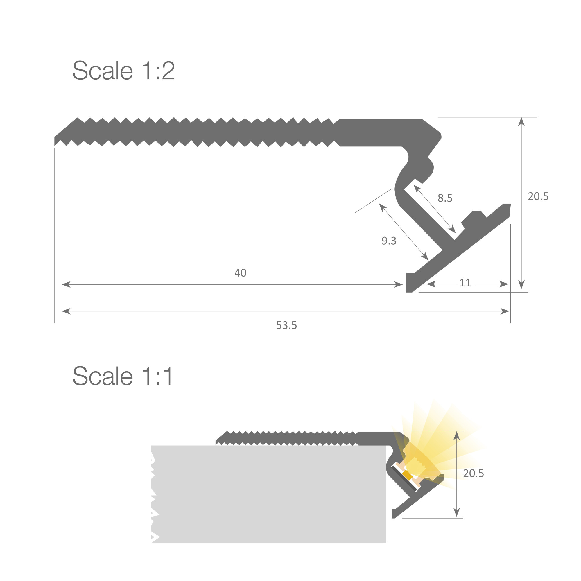 Le profilé Aluminium Niza eco est un profilé pour Escalier Architectural de qualité Professionnelle. Avec une largeur intérieure de 8.5mm, permettant l’adaptation de ruban LED jusqu’à PCB 8mm. Grâce à ses dimensions de 20.5mm de hauteur uniquement, et sa fabrication en aluminium de grande pureté, il saura habiller vos intérieurs. Idéal pour applications en bord d’escalier pour un éclairage en hauteur. Dissipe la chaleur de ruban LED jusqu’à 20W/m. Étant IK10 grâce à son Diffusant dédié il est hautement résistant, lui permettant de supporter le passage des personnes sans risque de rupture ou de fissure.