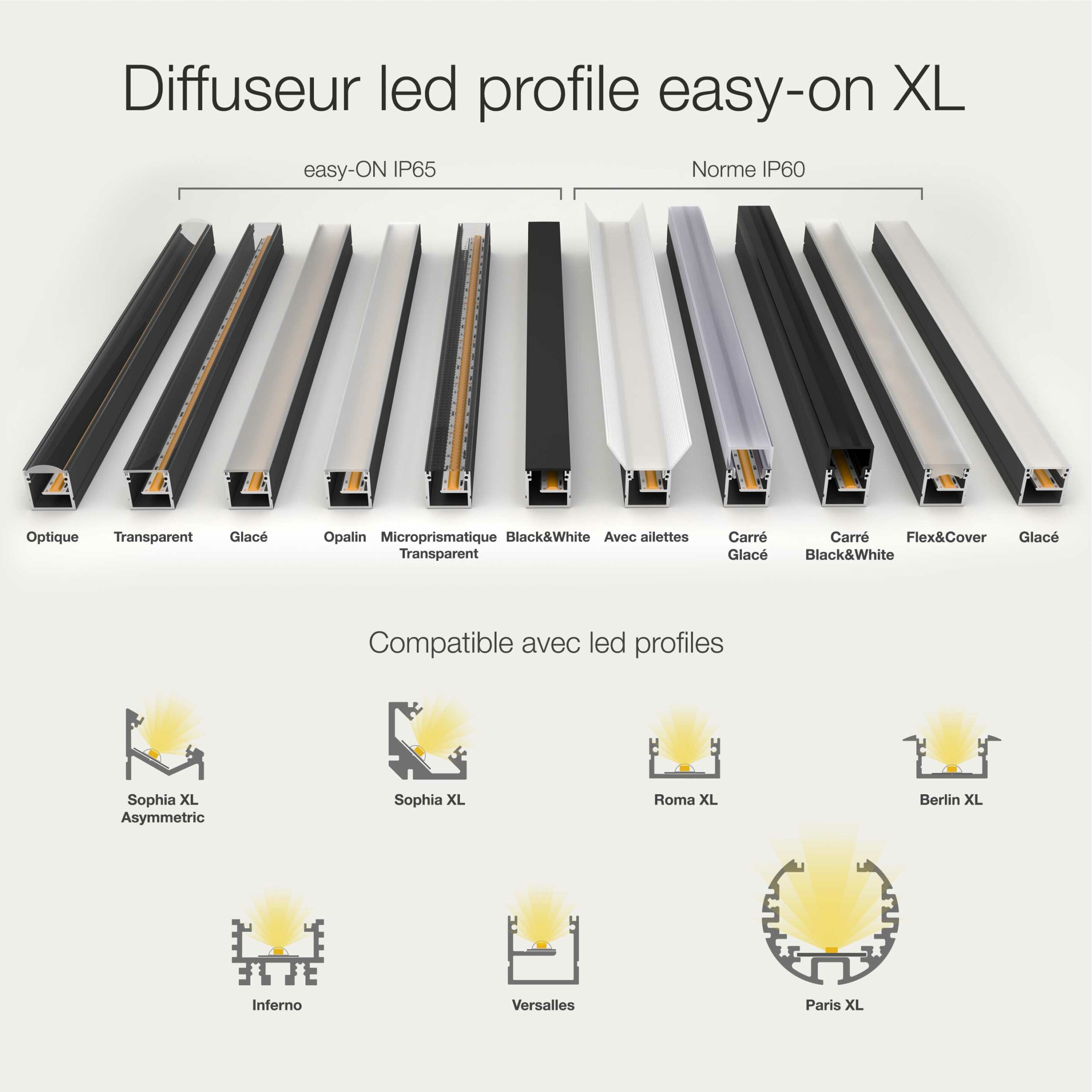 Il est compatible avec tout les diffusant au système Easy-On. Le système Easy-on vous permet de simplement clipser votre diffuseur sur le profilé sans aucun effort et très facilement, ce qui le rend interchangeable et pratique d’utilisation même pour les plus novices.