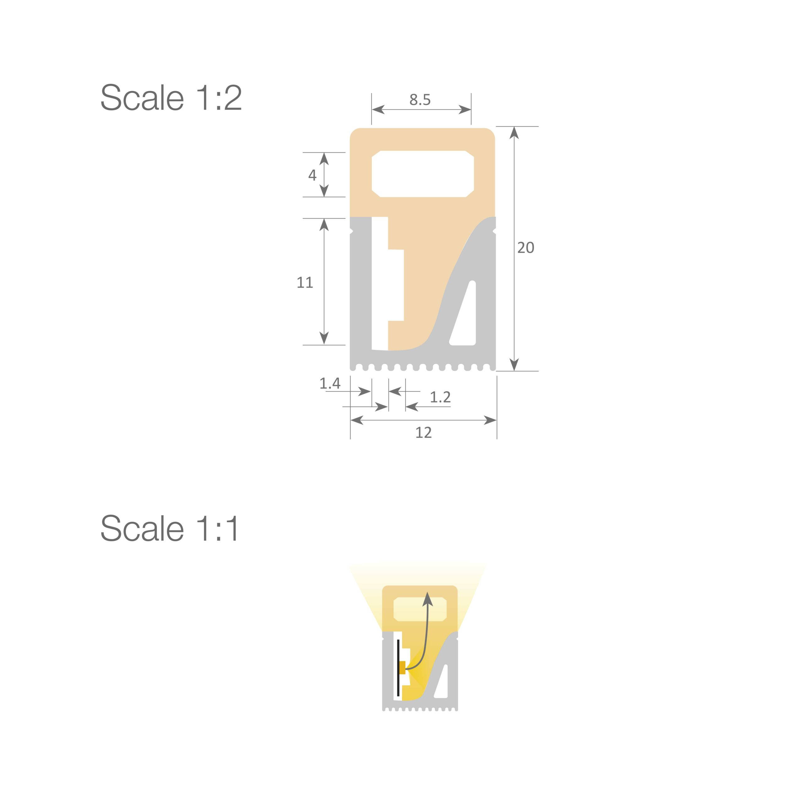 Profil en silicone de haute qualité avec une partie latéral opalin de qualité Professionnelle. Ce modèle permet d’éclairer des reliefs, corniches ou de réaliser un éclairage périmétral décoratif. Cependant il est spécialement indiqué pour les lettres et textes publicitaires de grandes dimensions. Il dispose d’une cavité interne pour loger le ruban LED. Celui-ci doit être IP20 avec un PCB de 10mm et non supérieur à 14W/m. Grâce à son étanchéité IP67 et sa protection UV, il s’agit d’un produit apte pour extérieur et zones humides. Il faut cependant sceller les entrées et sorties du ruban avec du silicone supplémentaire.
